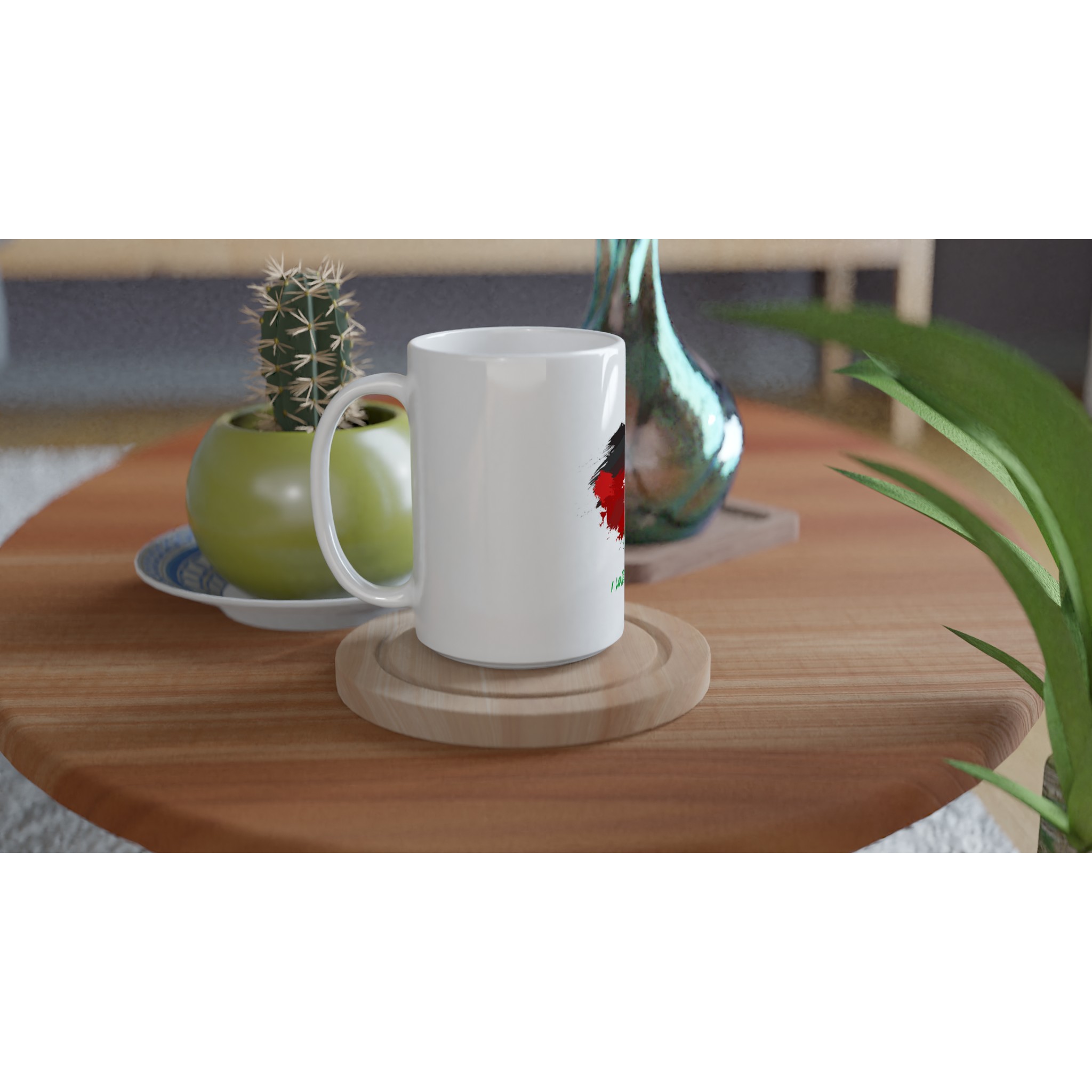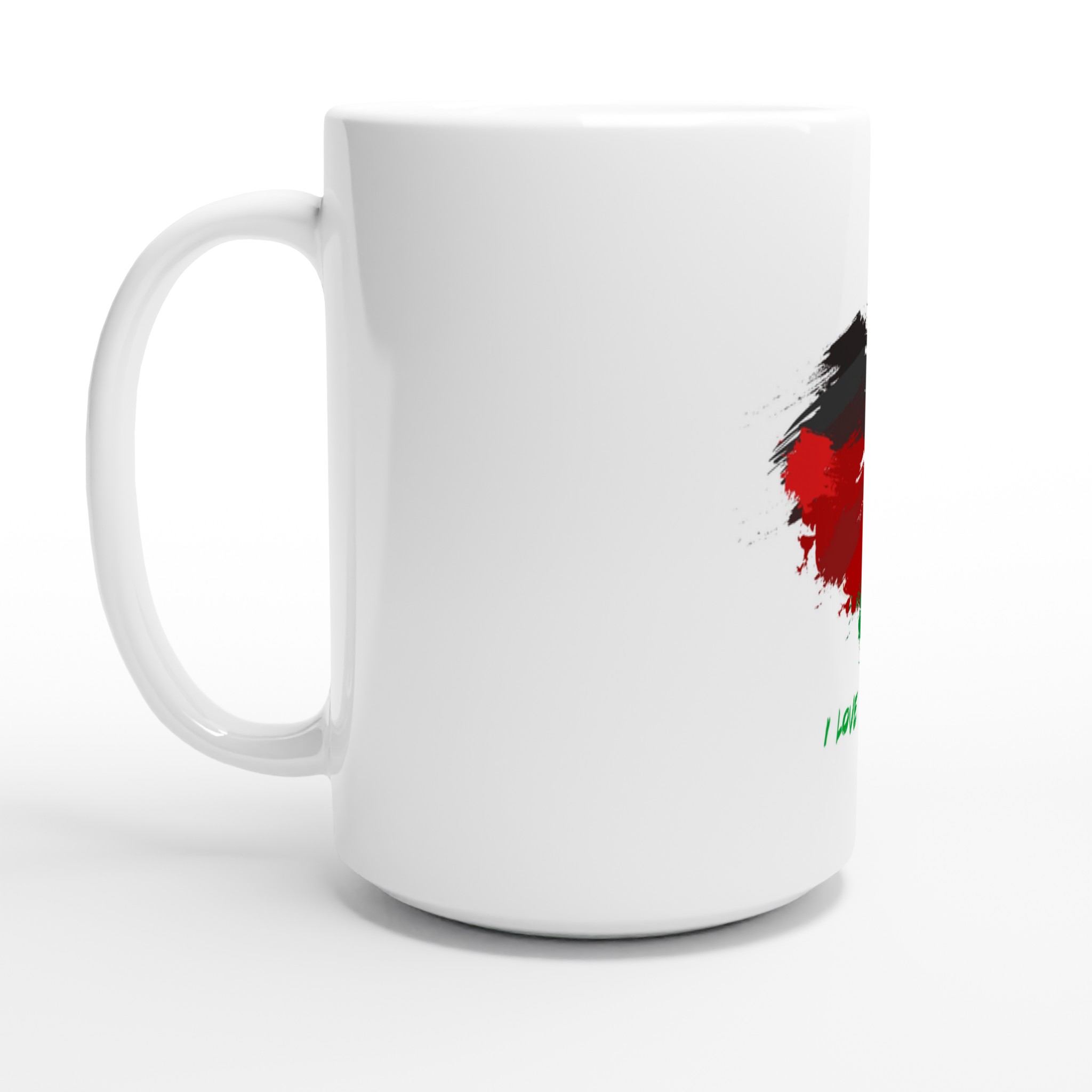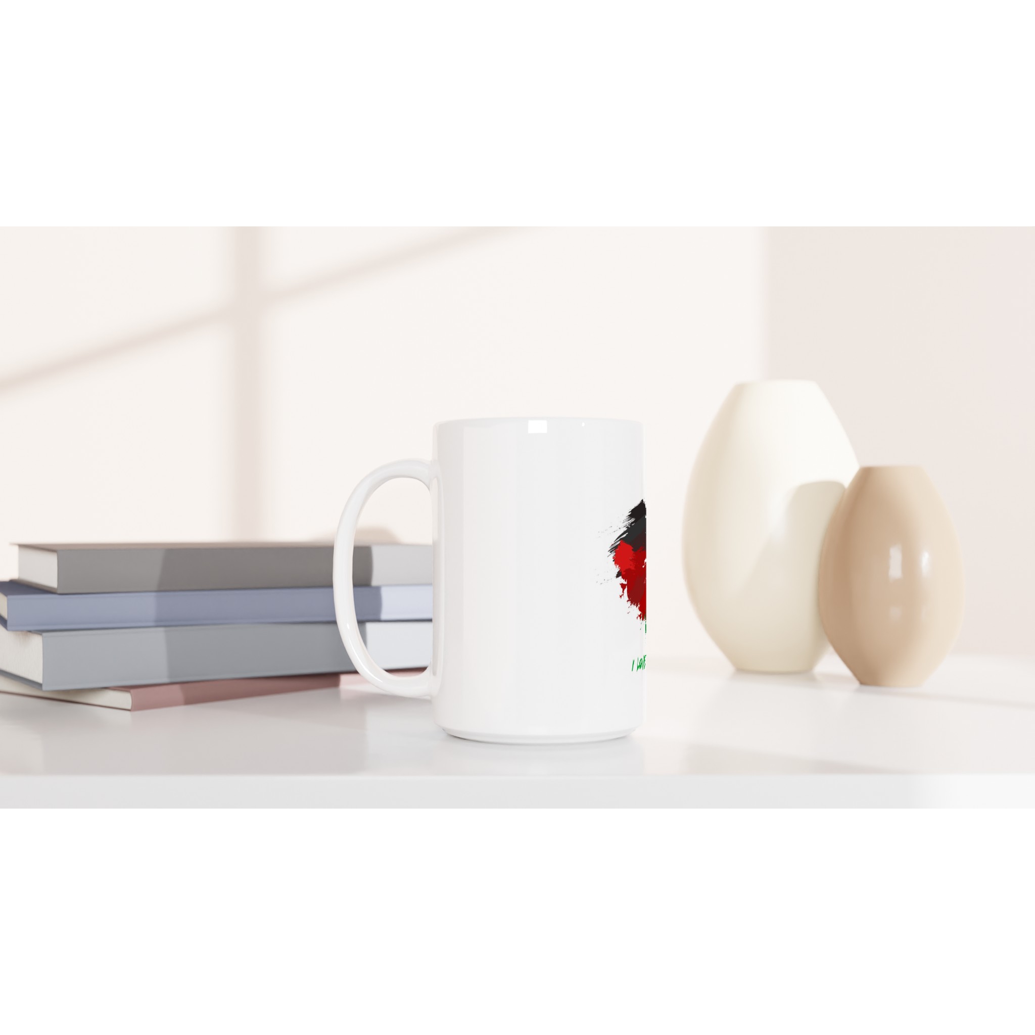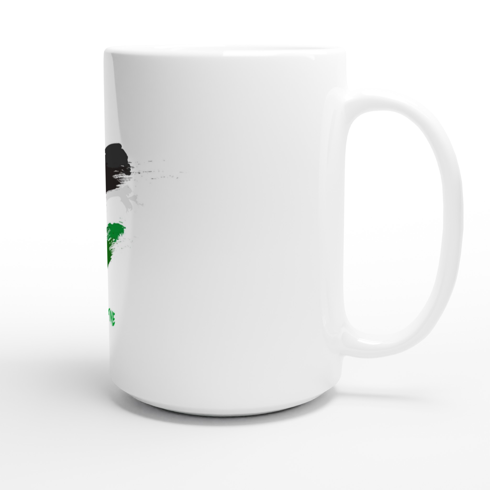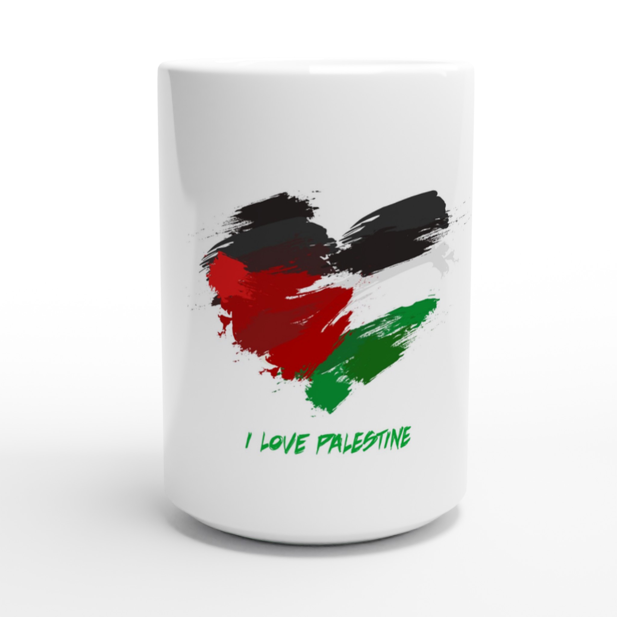 Dette 440 ml keramiske kaffekruset er perfekt for enhver anledning. Enten det er din morgenkaffe, en varm sjokolade eller en annen varm drikke du liker, er dette kruset helt riktig. Kruset har et glanset hvitt design og et levende, trykt motiv med teksten “I Love Palestine” sammen med et hjerte og flagg, som gir det et kraftfullt og kjærlighetsfullt uttrykk. Trykket er laget med høykvalitets blekk, som kommer ut vakkert og levende, og beholder sin kvalitet og glans selv etter gjentatt bruk i mikrobølgeovn og oppvaskmaskin.