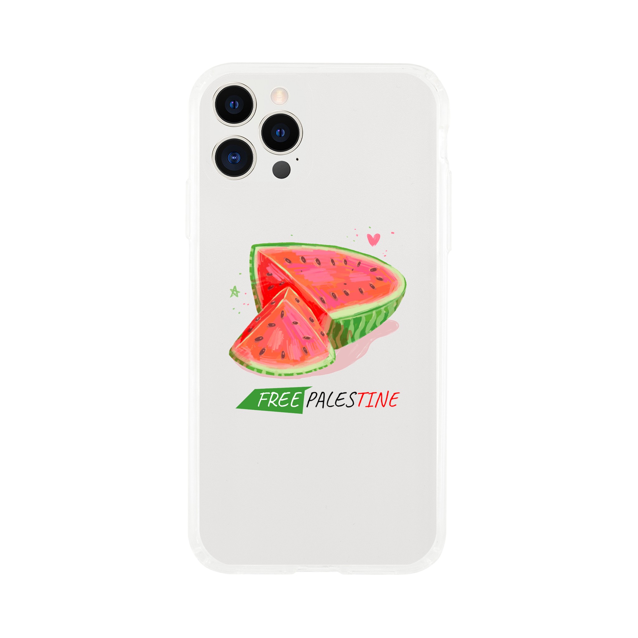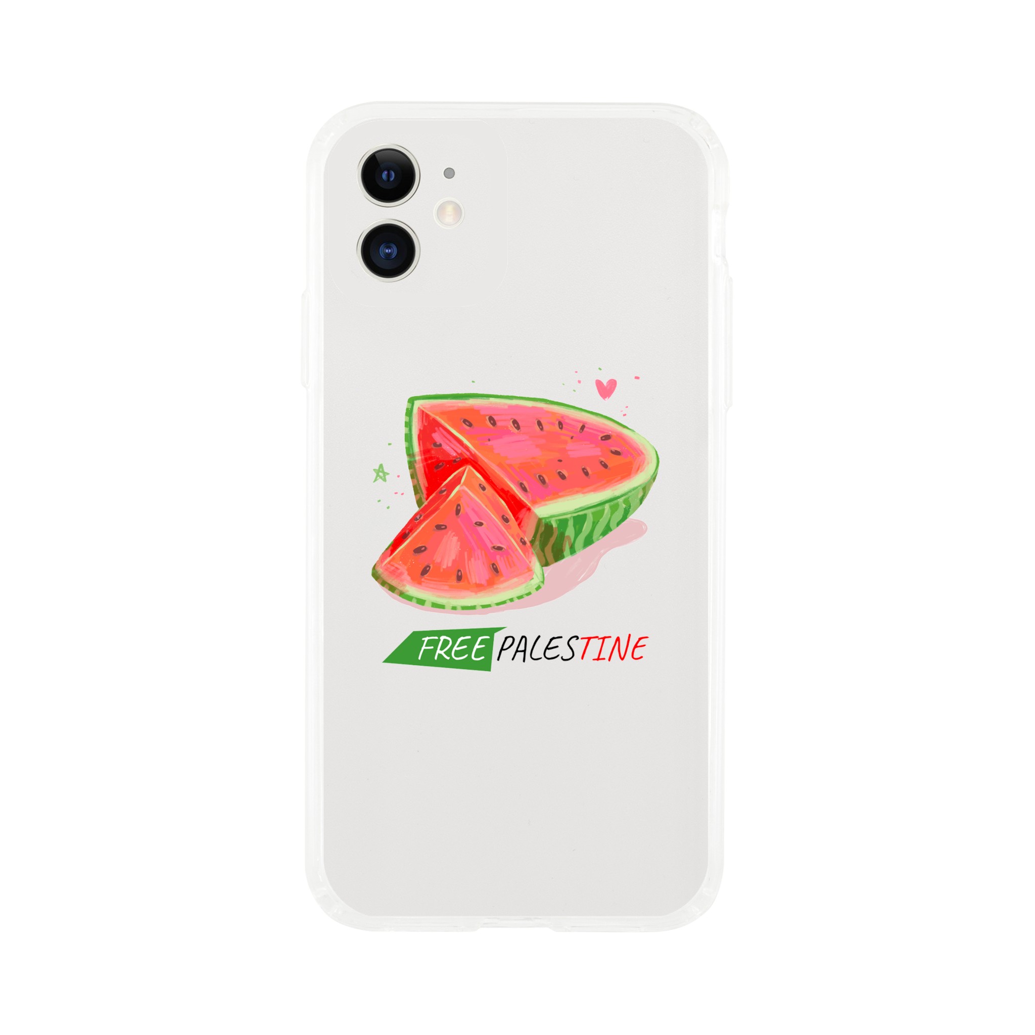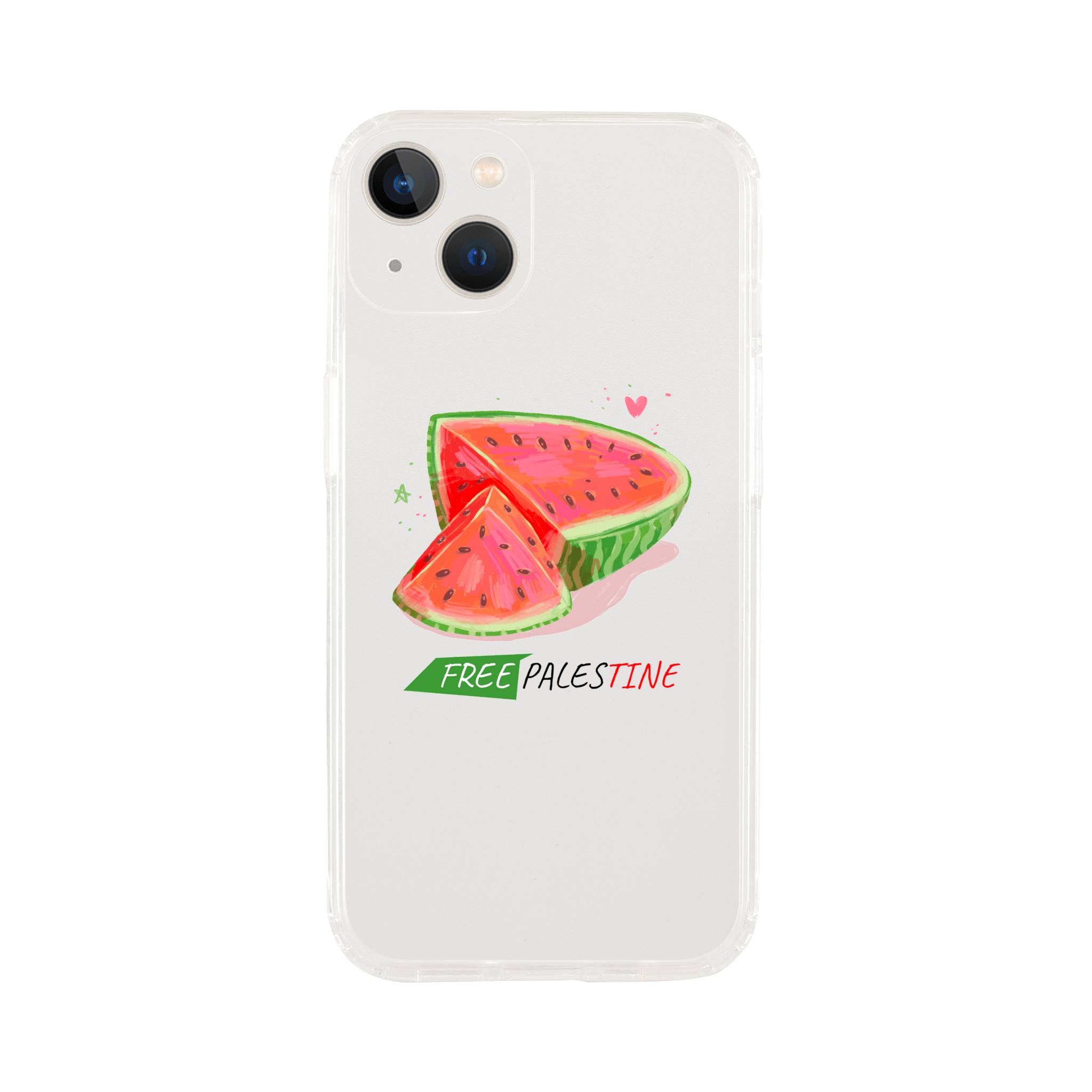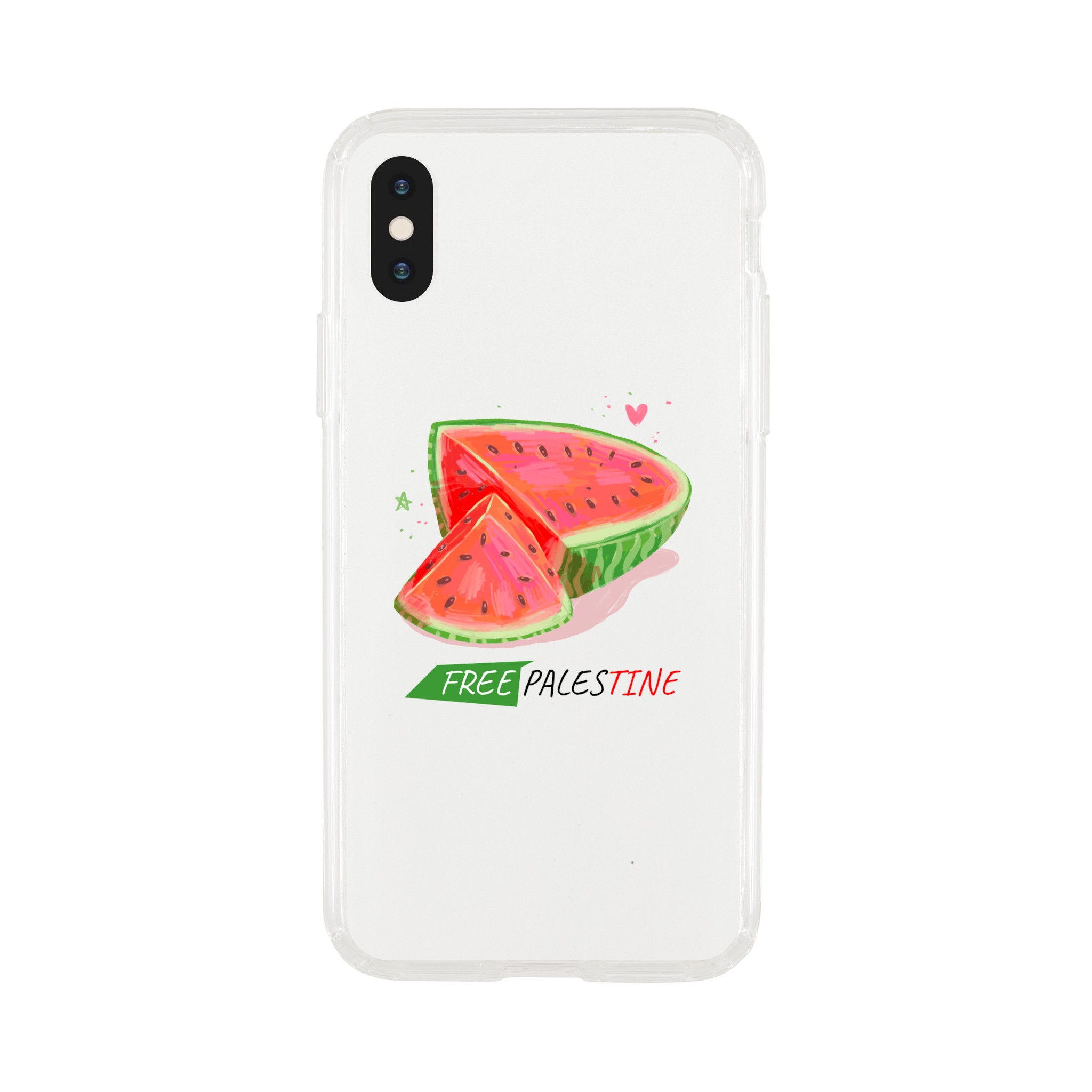 Iphone X- Iphone 15 – Gjennomsiktig etui trykket med vannmelon og «Free Palestine»