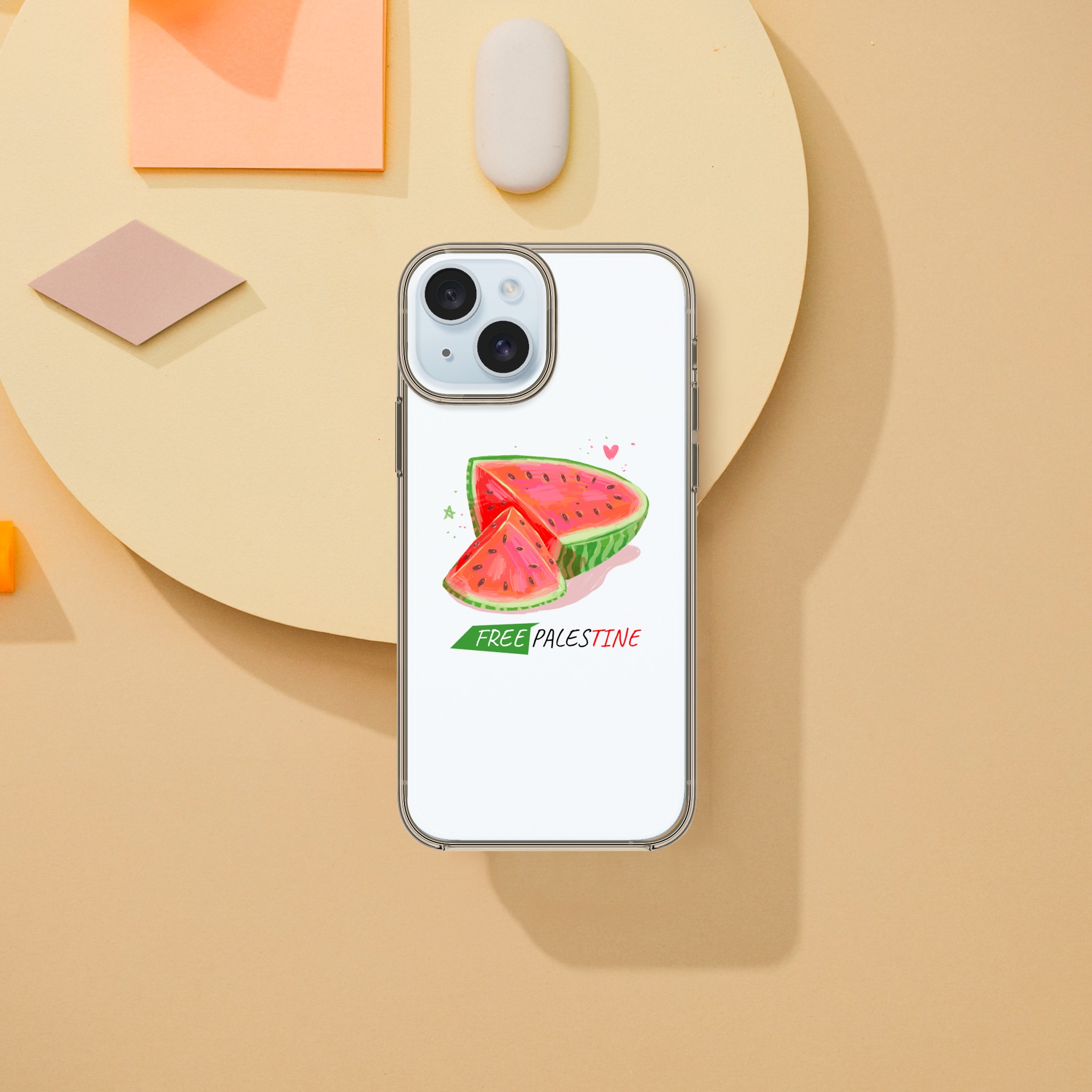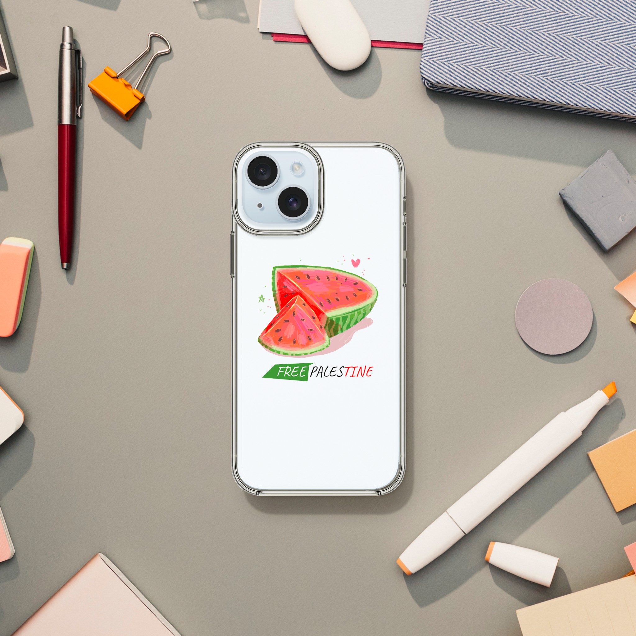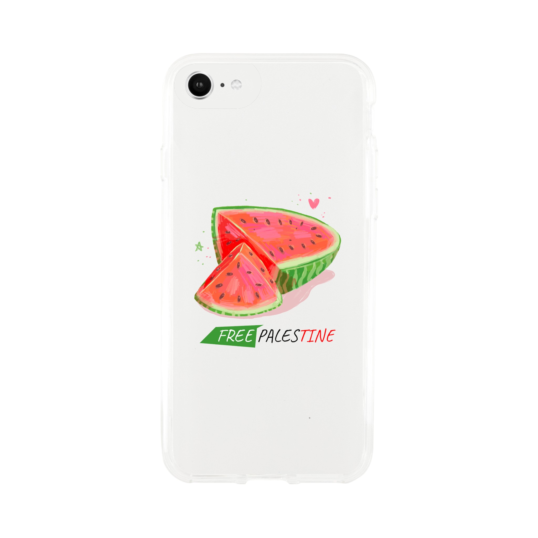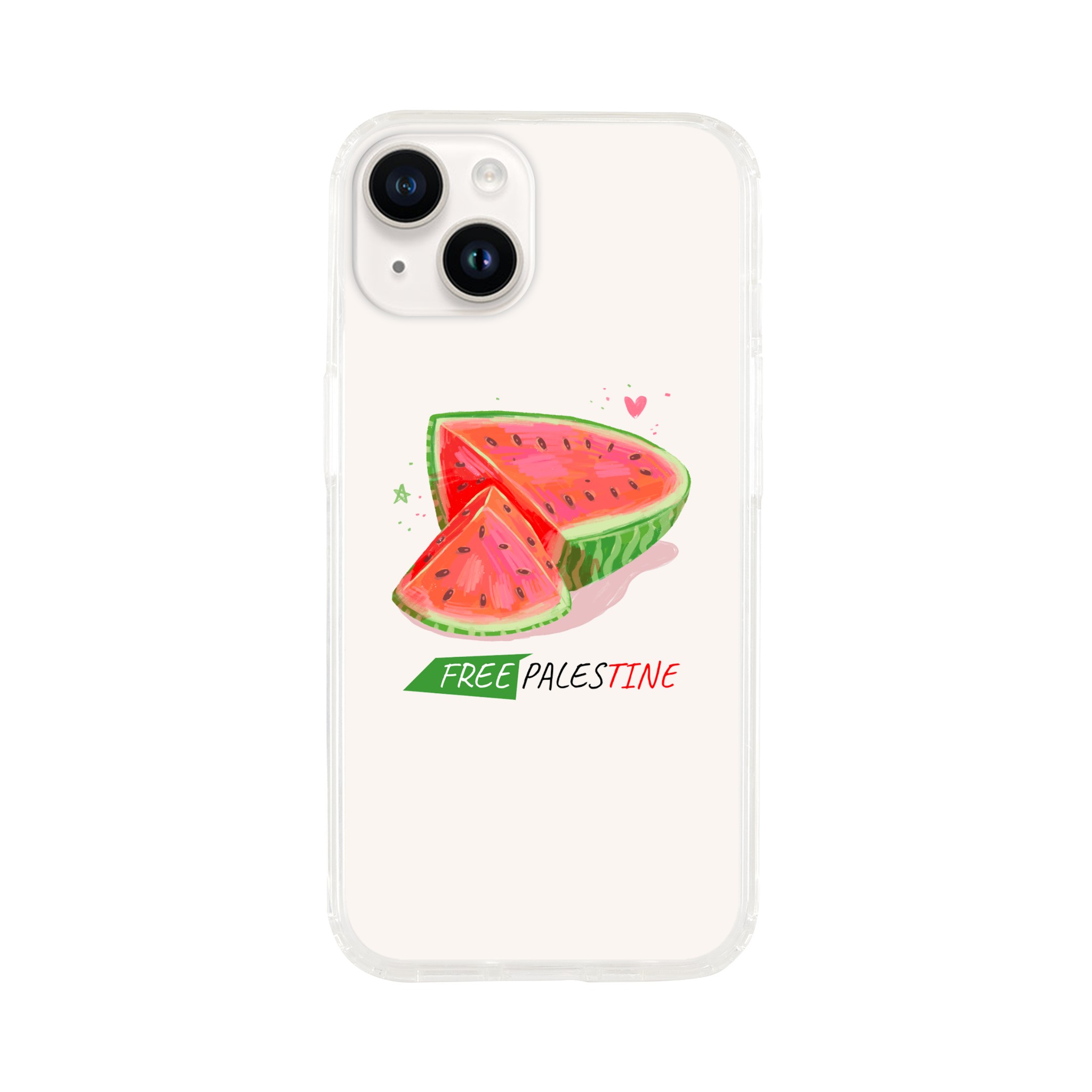 Iphone X- Iphone 15 – Gjennomsiktig etui trykket med vannmelon og «Free Palestine»
