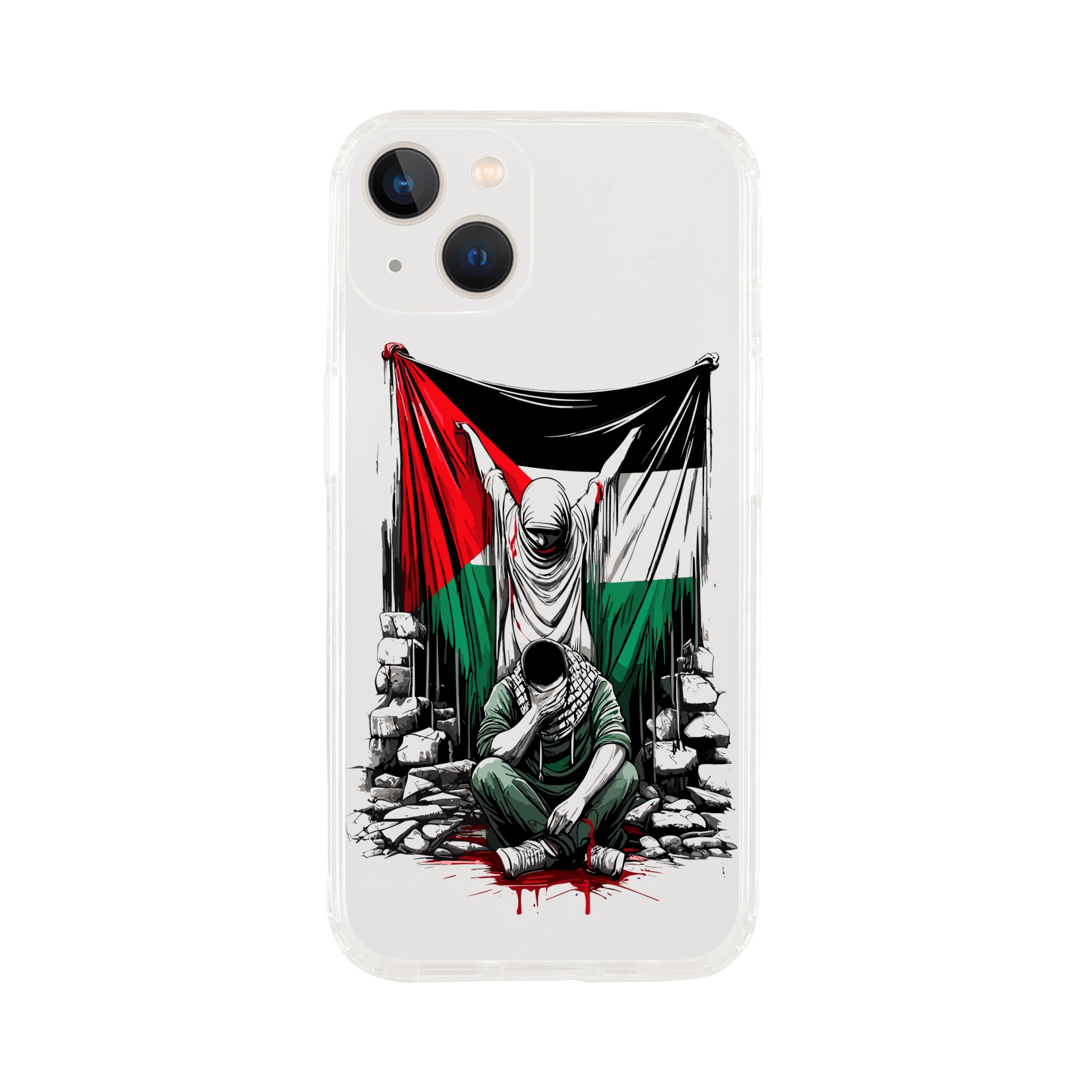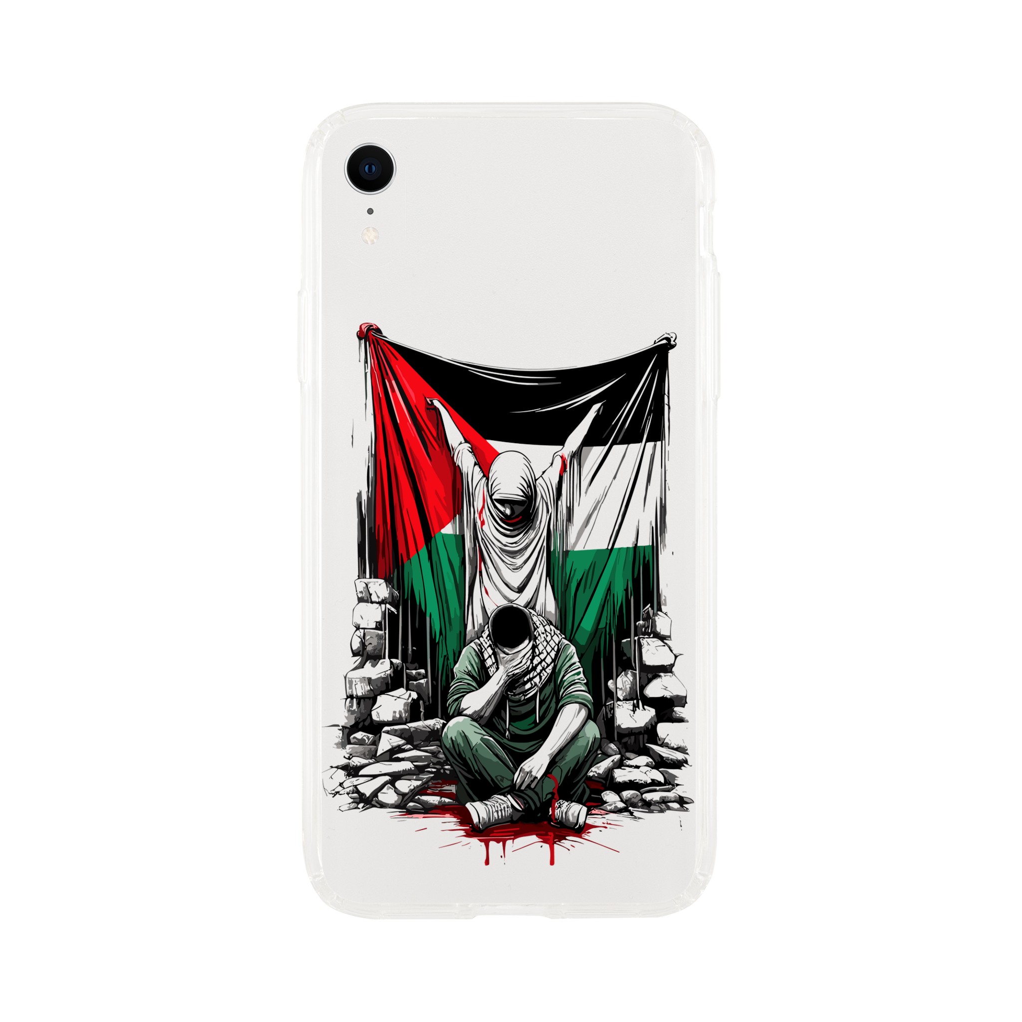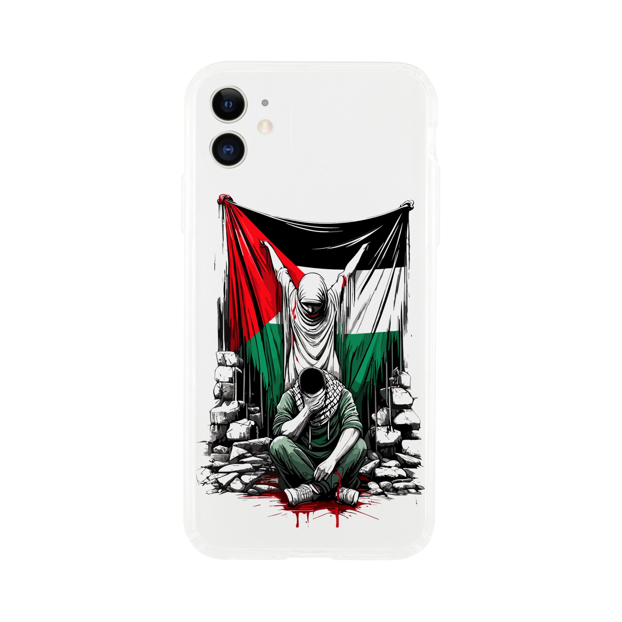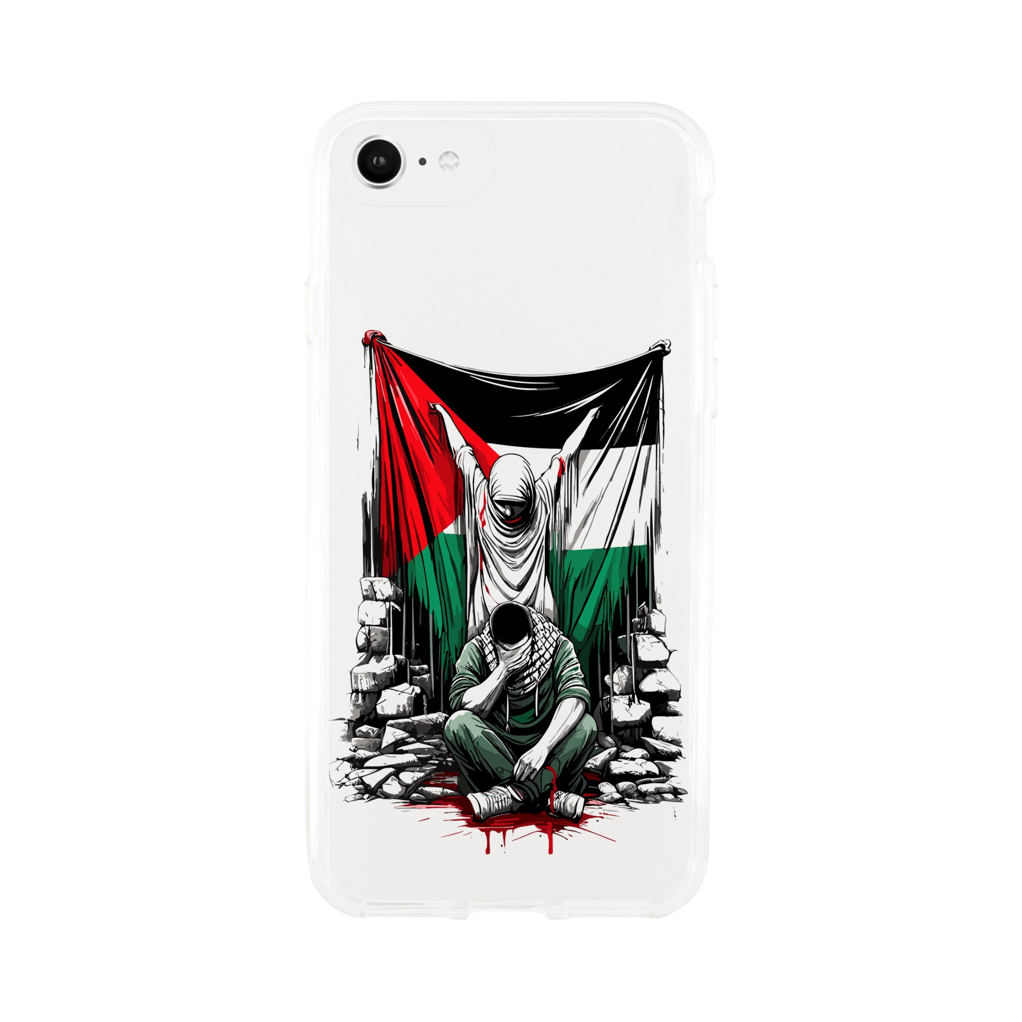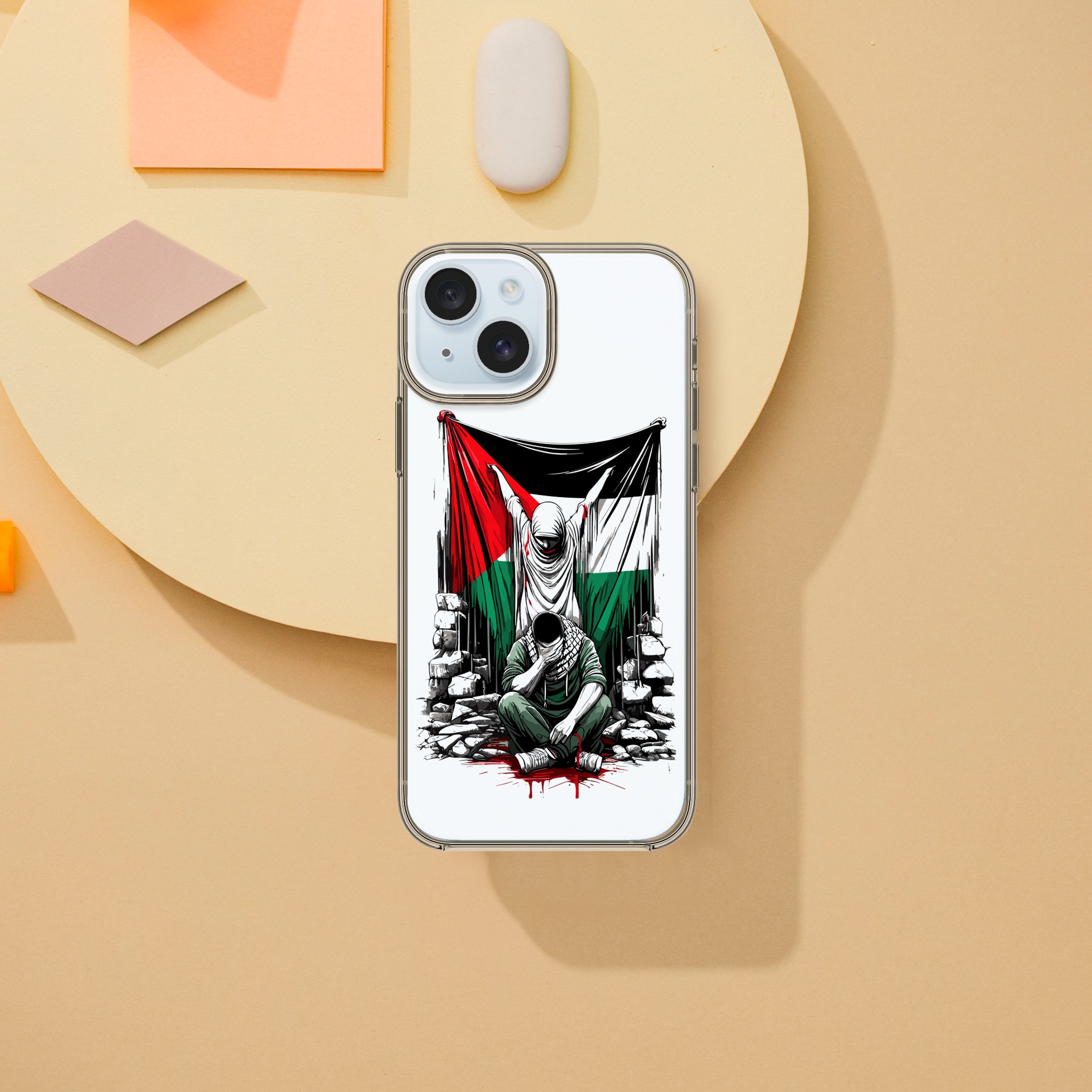 Vis din støtte til Palestina med dette meningsfulle, gjennomsiktige mobildekselet. Den har et design av en kvinne som holder det palestinske flagget oppe, og en mann som sitter foran henne med hendene foran øynene. Det formidler et budskap om styrke og håp. Dette dekselet er mer enn bare et ordinært mobildeksel for telefonen din – det er et budskap om harmoni og støtte til det palestinske samfunnet.