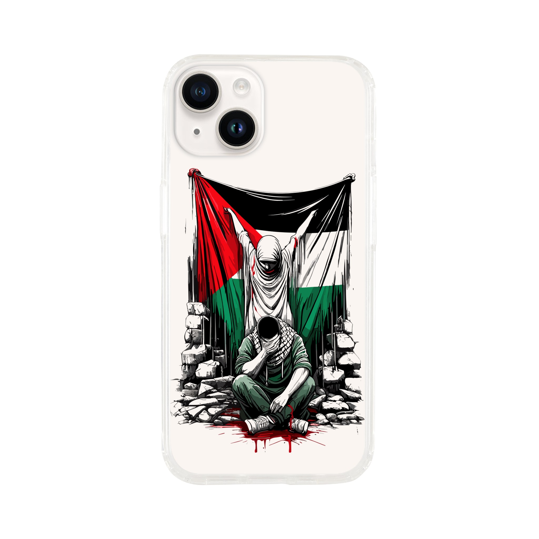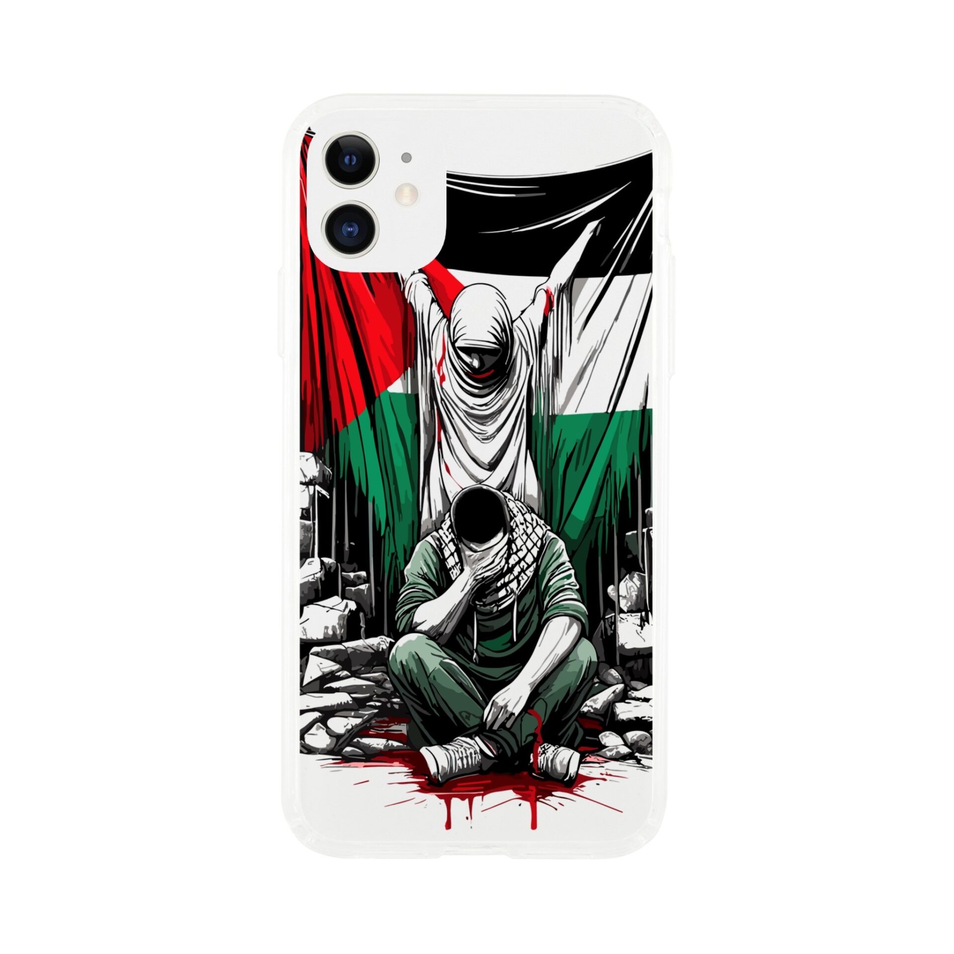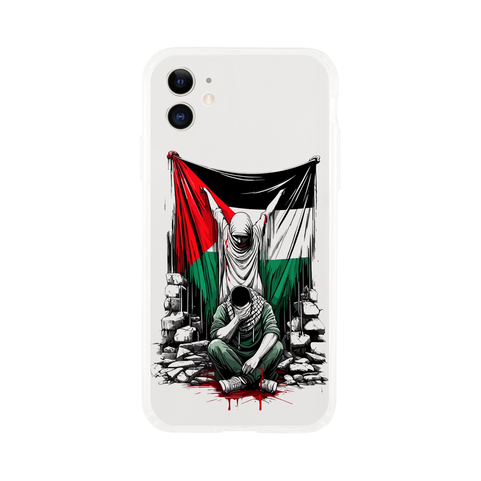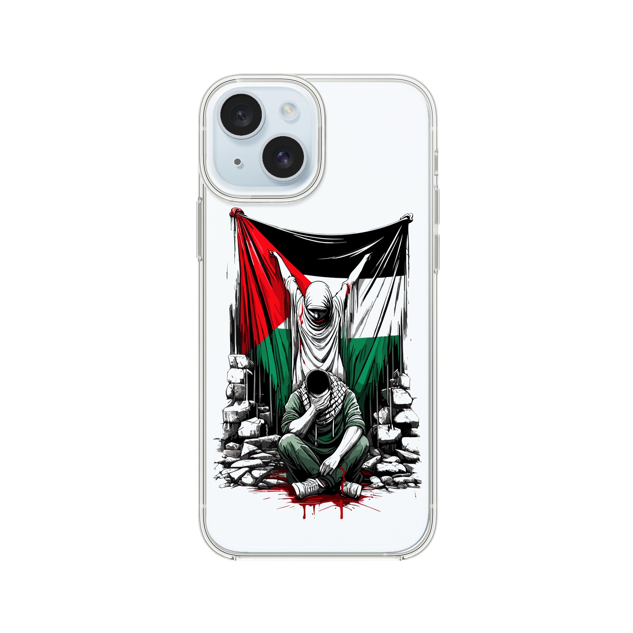Vis din støtte til Palestina med dette meningsfulle, gjennomsiktige mobildekselet. Den har et design av en kvinne som holder det palestinske flagget oppe, og en mann som sitter foran henne med hendene foran øynene. Det formidler et budskap om styrke og håp. Dette dekselet er mer enn bare et ordinært mobildeksel for telefonen din – det er et budskap om harmoni og støtte til det palestinske samfunnet.
