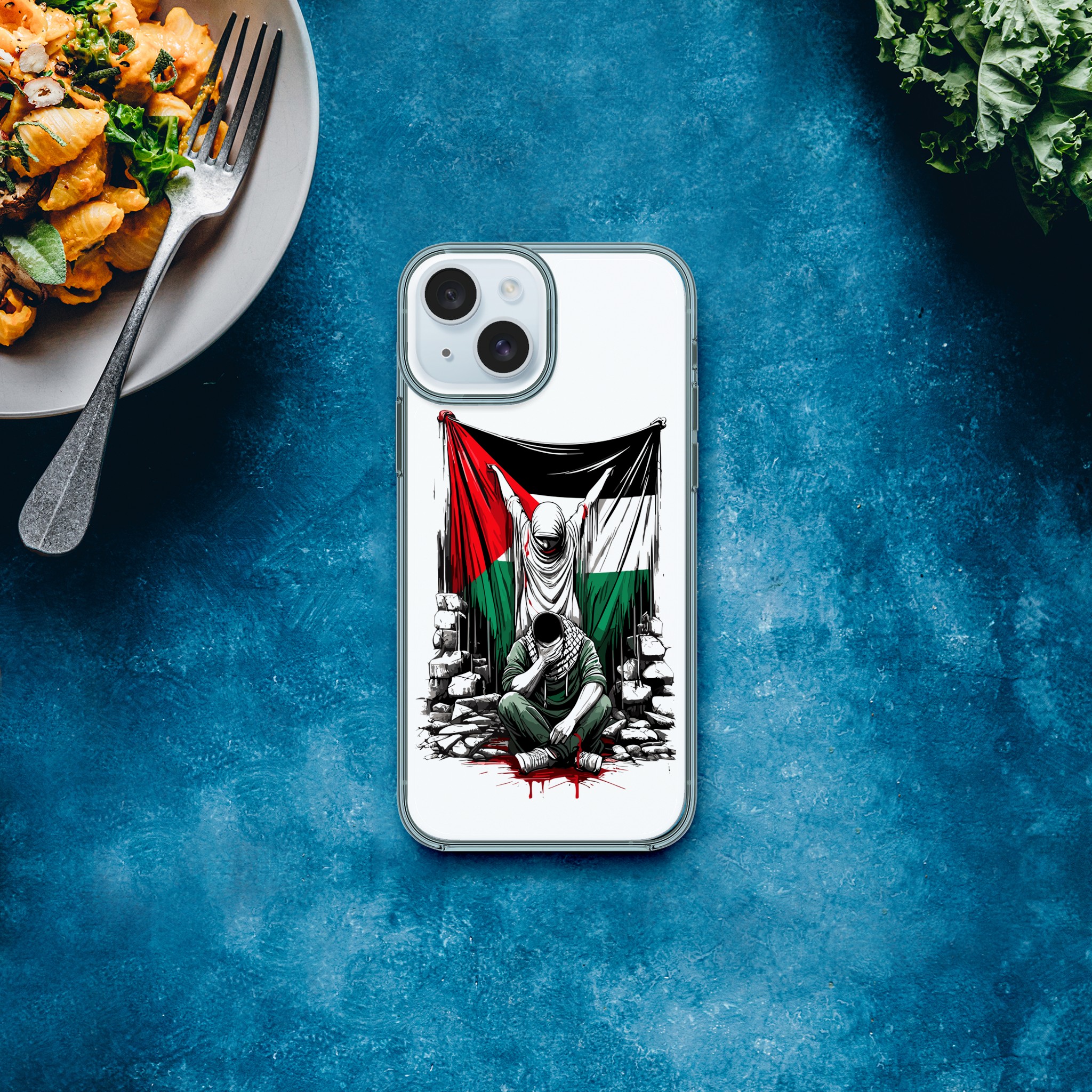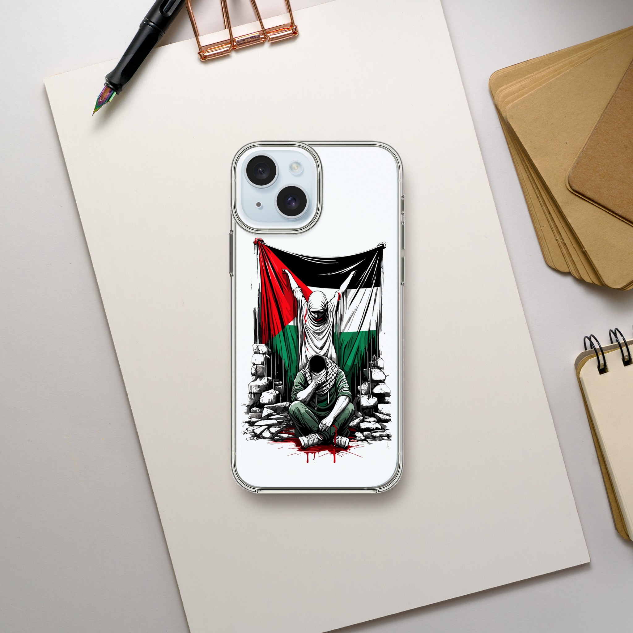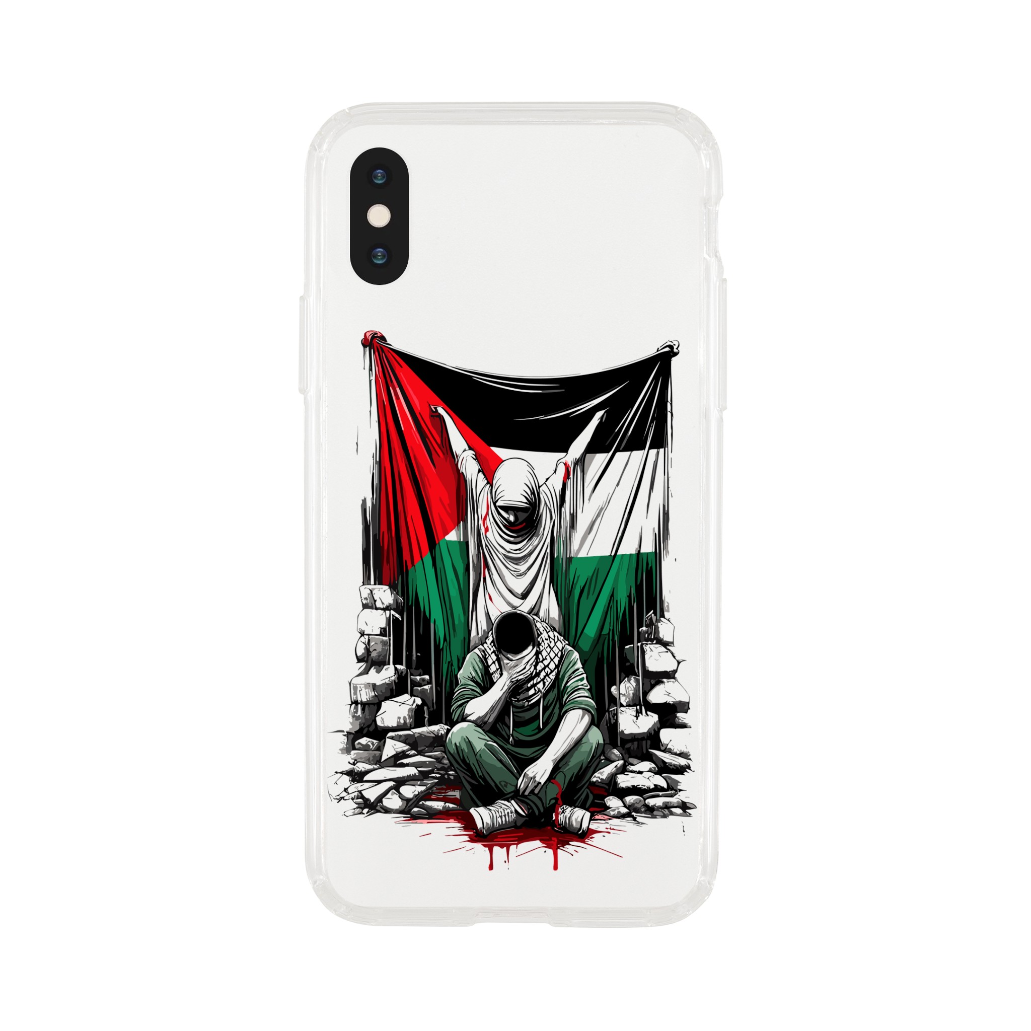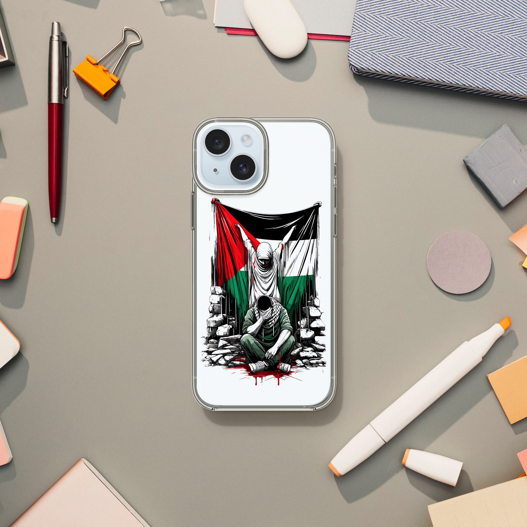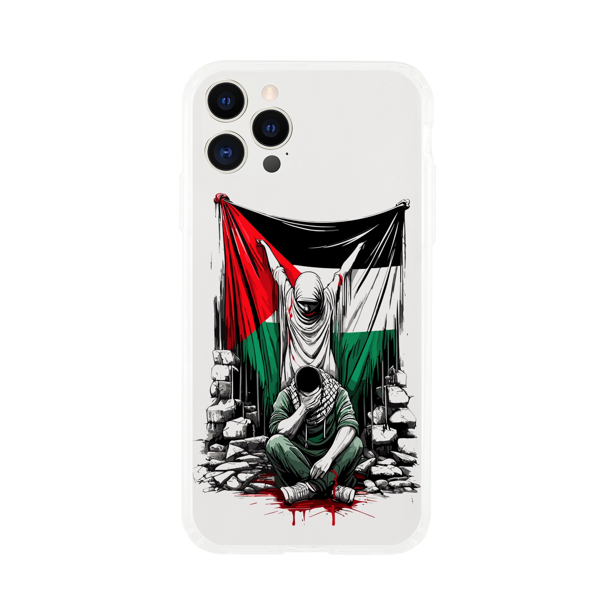Vis din støtte til Palestina med dette meningsfulle, gjennomsiktige mobildekselet. Den har et design av en kvinne som holder det palestinske flagget oppe, og en mann som sitter foran henne med hendene foran øynene. Det formidler et budskap om styrke og håp. Dette dekselet er mer enn bare et ordinært mobildeksel for telefonen din – det er et budskap om harmoni og støtte til det palestinske samfunnet.