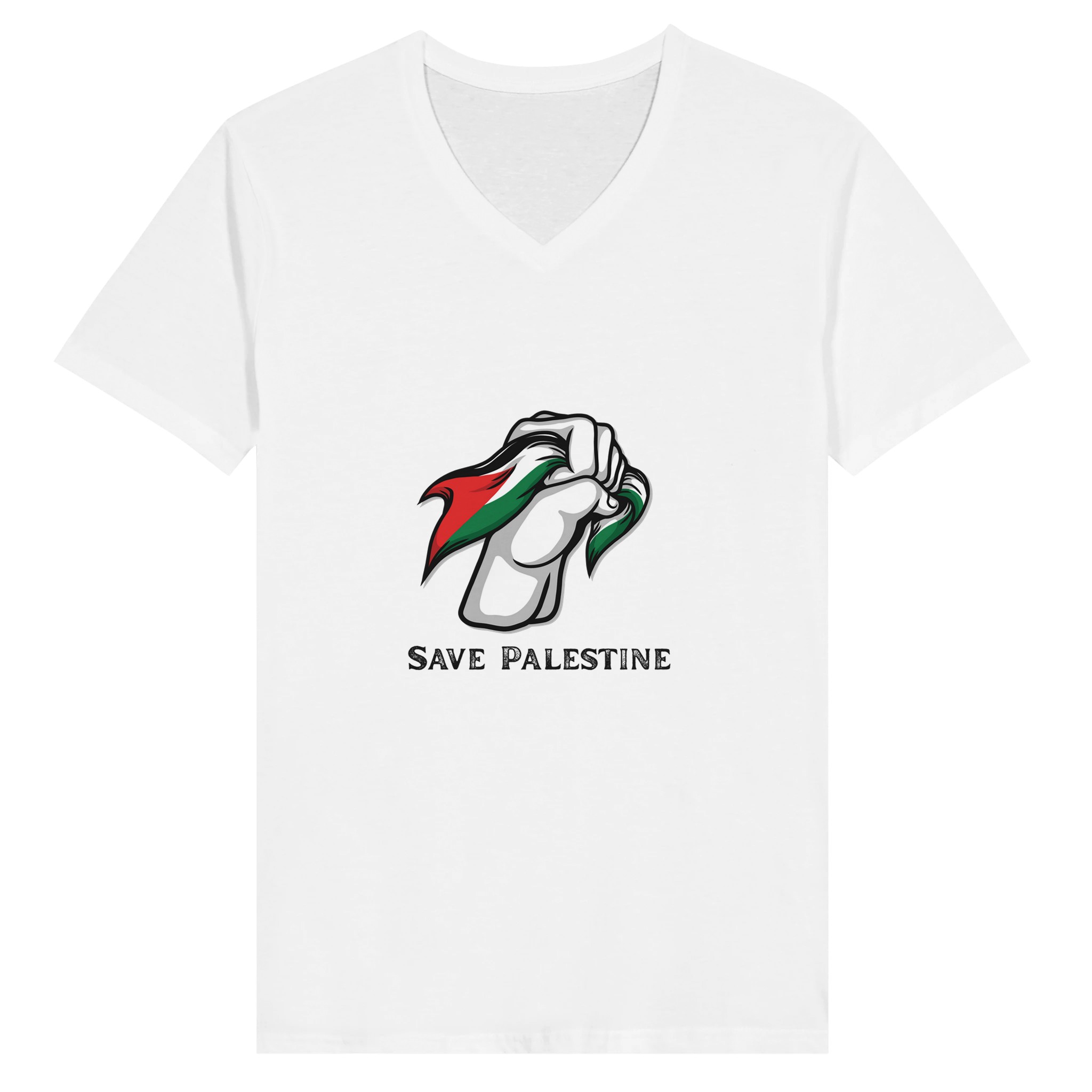 Denne essensielle unisex jersey-t-skjorten passer som en populær favoritt, med en klassisk V-hals, korte ermer og overlegen kammet og ringspunnet bomull som fungerer som det beste tomme lerretet for trykking. T-skjorte er også design med en hånd som holder Palestina-flagget